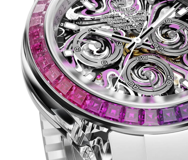 The AET Remould Genesis Collection Daytona-Nebula Gemstone Sapphire (Limited Edition of 3 Pieces) is crafted in a 40 mm case size in a polished sapphire crystal. The bezel in 18K white gold set with natural gem sapphires in gradations of color, transitioning from orange-red to purple and pink, creating a mesmerizing nebulous flow of color.