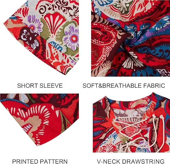Features:Fashion printing shirts,short sleeve, soft and elastic , unique printing pattern design, simple style,lightweight, drawstring collar design,loose fit.