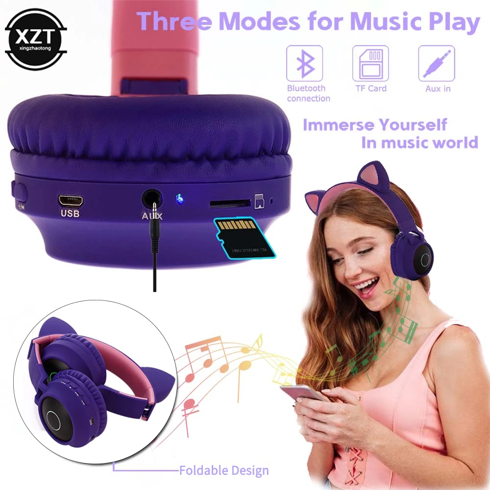 Cute Cat – casque d'écoute sans fil Bluetooth 5.0, musique Hifi, double stéréo, basse, lumière LED, pour téléphones mobiles, filles, Support carte TF